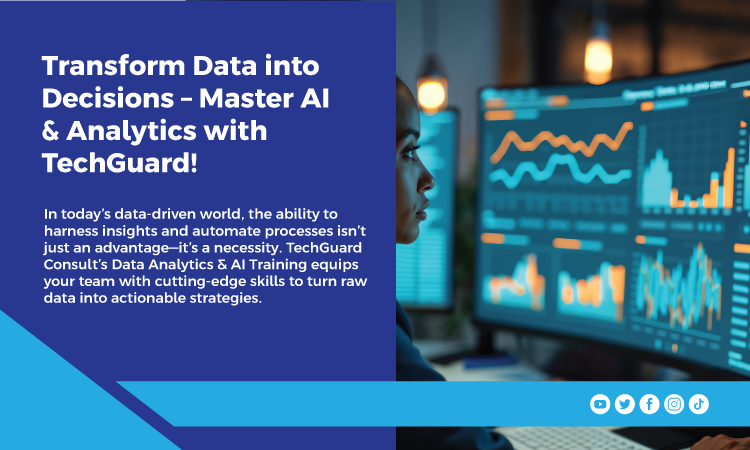 In today’s data-driven world, the ability to harness insights and automate processes isn’t just an advantage—it’s a necessity. TechGuard Consult’s Data Analytics & AI Training equips your team with cutting-edge skills to turn raw data into actionable strategies.